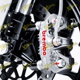 STANDARD: Disco singolo Ø 230mm flottante spessore 4,5mm. Pinza radiale Brembo (4 pistoni D24). Pastiglie sinterizzate. Pompa assiale Brembo PS 10/19 con serbatoio integrato e tubo in treccia metallica.
